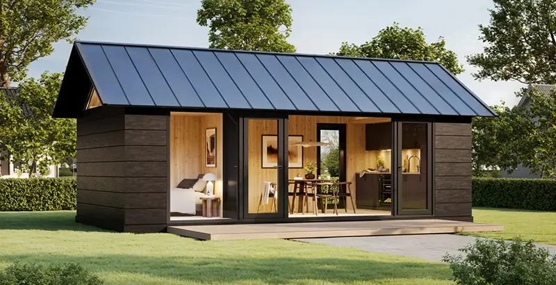 - Ett modernt attefallshus helt byggt i korslimmat trä som ger både stabilitet och en varm, naturlig känsla.
